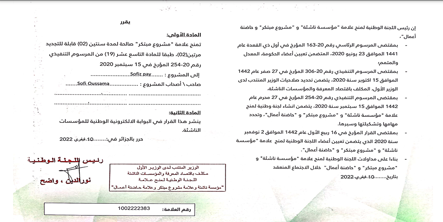 We applied for the official Startup Label to gain recognition and support under Algeria's national innovation program.